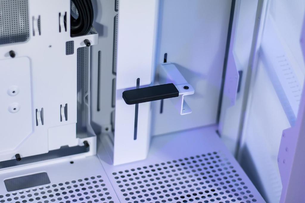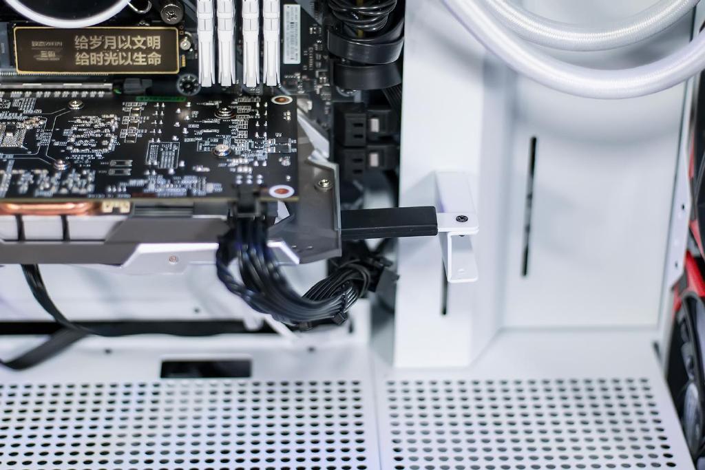 机箱标配一个显卡支架,避免出现主板不堪负重被压弯的情况,支架并采用左右两层不同高度的设计,可根据不同长度尺寸的显卡调节固定,支架末端可随心调整不同旋转角度,因此有着不错的安装兼容性,还有耐热值达240℃的硅胶垫包裹。