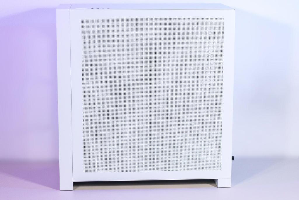 前面板采用按压式开关设计,面板可调节范围为10°,用户可通过按压面板的右上角处打开面板,前面板自带镂空进风孔,当面板打开后进风口会更大,增强机箱内部的散热效果,至于实际降温效果方面,与前置散热风扇的转速与进风量等要素相关。