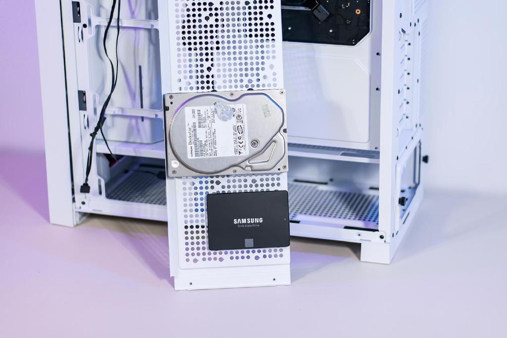 硬盘托架隐藏在左侧的金属盖板背后,机箱最多可安装三个2.5英寸或3.5英寸硬盘,这个硬盘数量基本足够的,随机附带了硅胶垫圈与安装螺丝,可以起到同时防震保护的作用,安装硬盘时需将托架先取下,将硬盘固定在托架上,再将托架安装回机箱侧面即可。