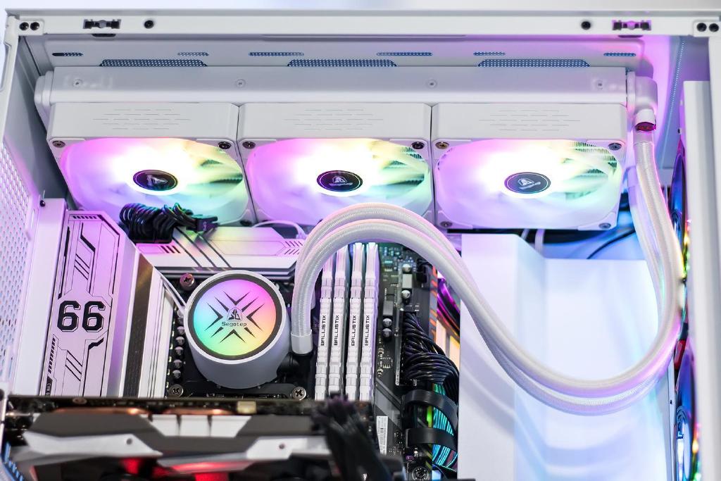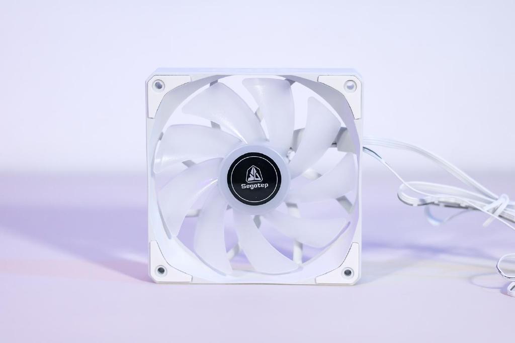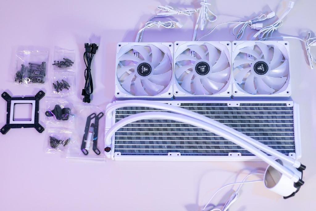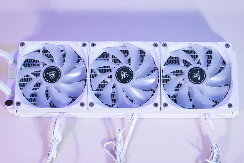 水冷散热器标配三把12cm散热风扇,支持RGB动态灯光效果,外框架与线缆均采用白色设计,风扇叶片采用乳白色半透明设计,双面四个角均有缓冲的橡胶脚垫,最大输入电压电流为12V/0.28A,支持PMW智能调速,风扇转速为800~1800RPM,风量为82.61CFM。