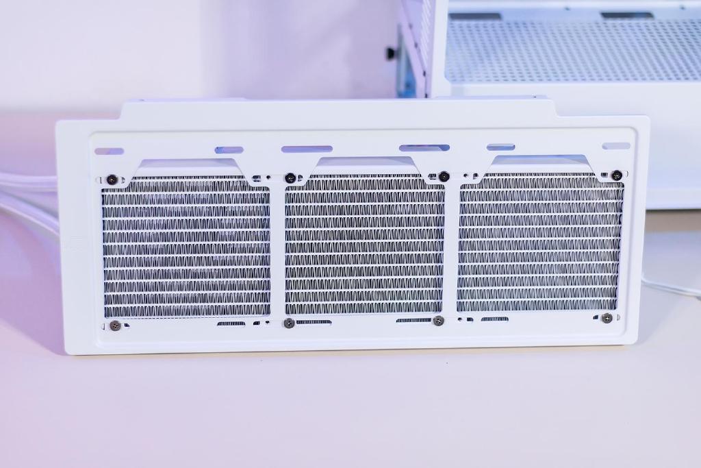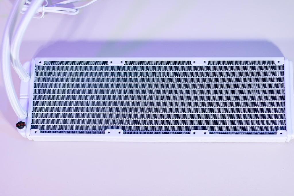水冷散热器目前由黑与白两种配色版本可选,本次搭配的是白色机箱那必然选白色版,水冷头、冷排、鳍片与水管均为白色,冷排的做工相当规整,鳍片边缘较为平滑,冷排尺寸规格为394*120*27mm,基本上支持360水冷的机箱均可轻松安装。