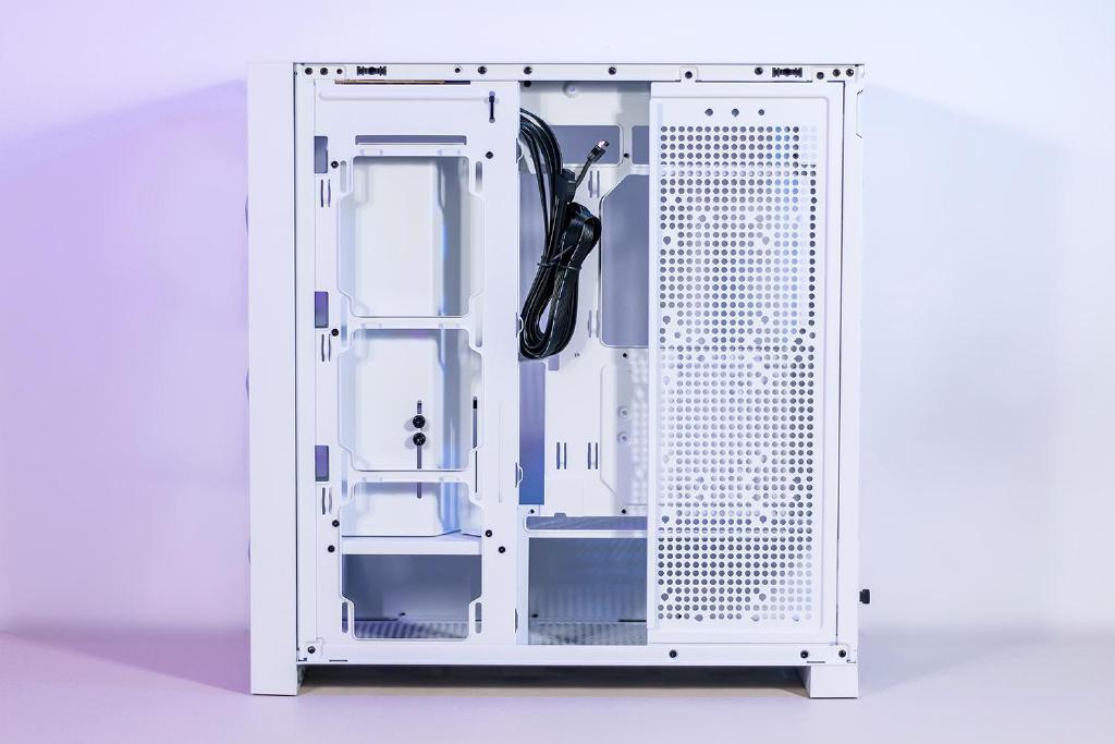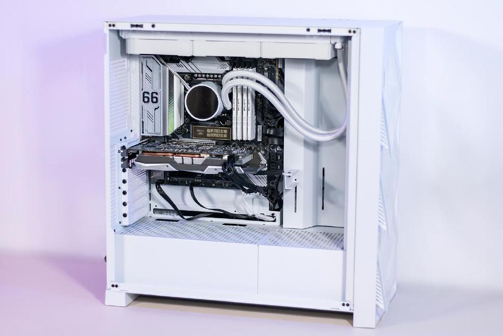 鑫谷昆仑御风机箱采用纯白的配色设计,更趋于简约低调的造型风格,显得更符合大多数的审美,能搭配不同风格的桌面,机箱左侧与前部均为高透亮的玻璃,将内部硬件配置及RGB动态灯效尽收眼底,前面板采用可转换形态的设计,打开面板后可增加进风效果,很好的解决进风量不足的问题,配备多个细密的防尘网,兼顾了高进气量和防尘功能。作为ATX规格的机箱机身体积尺寸适中,放置在桌面上也不会有很大压力,做工细节方面都很不错,多个部件采用免工具拆卸设计维护更便利,机箱拥有足够宽裕的安装兼容性,让玩家充足的自由发挥空间,不会带来什么兼容性的困扰。
