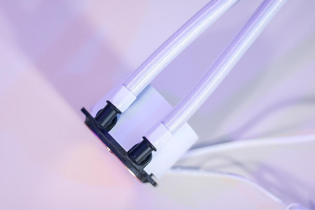 水冷头的外壳表面材质是工程塑料,水冷散热器的水管长度为480mm,外层采用FEP高分子材质,质地相当柔软抗拉耐折,并采用了可旋转式接头设计,具有一定的可旋转角度,接口处还有加强件包裹,能够更好的兼容不同尺寸的机箱,前置顶置都不成问题。