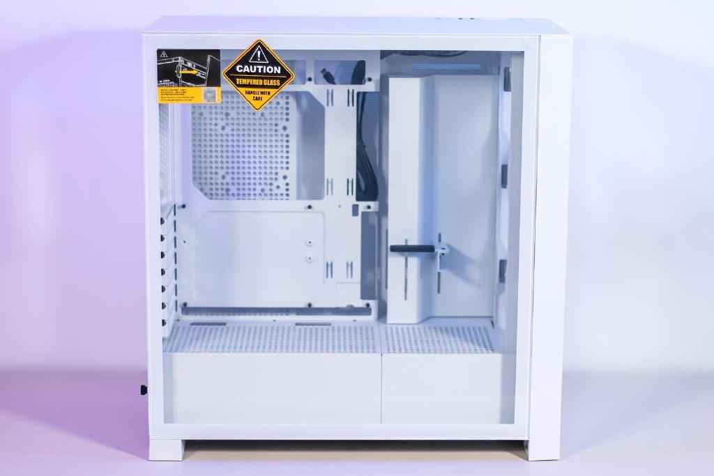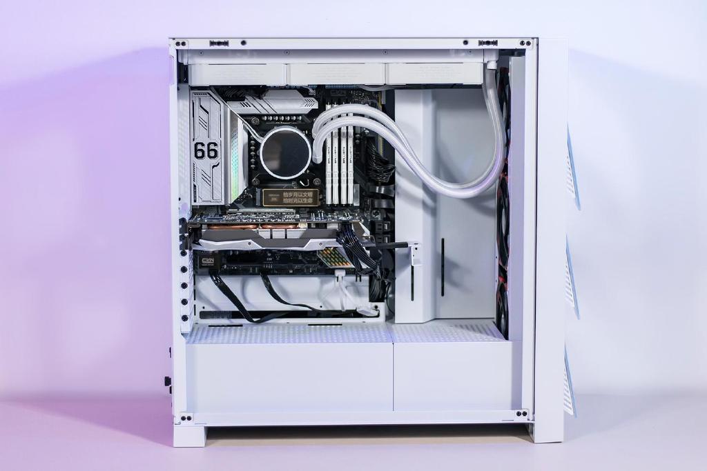 本次搭配使用的是鑫谷昆仑御风机箱,冰川白与幻影黑两种配色版本,白色的水冷散热器那必须需要搭配白色的机箱,机箱整体采用较为传统的方正造型,通体为纯白色相当亮丽,左侧面为大面积的侧透玻璃,并没任何熏黑处理实际的透光效果很好。