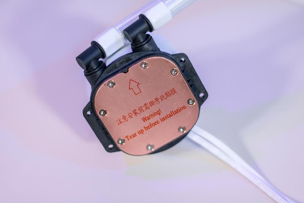水冷头的底座采用了导热系数较好的纯铜材质,面积为29cm2,表面还有打磨处理略带镜面的效果,四周共采用了八颗螺丝固定,底座与处理器表面的接触区域非常充足,内置水泵采用八极马达设计,最高转速可达2800RPM,水泵寿命可达四万小时。