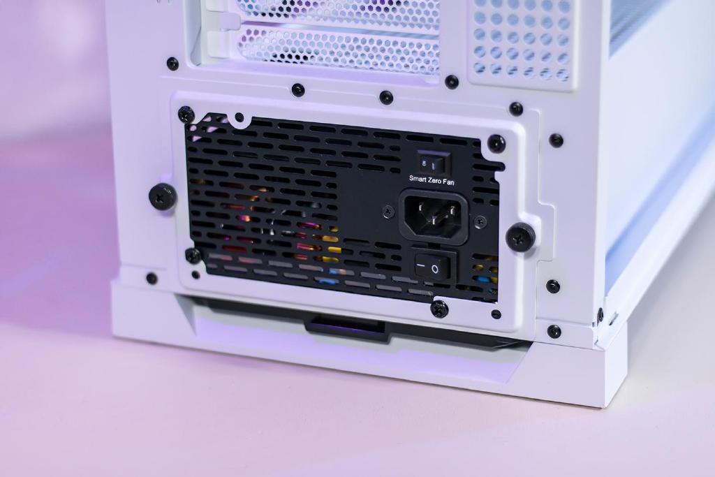 电源仓位于机箱的底部,兼容长度规格240mm以下的标准ATX电源,安装额定功率1250W或以上的电源均没问题,在安装时先电源固定在金属托架上,从后方往机箱内部放置安装即可,电源仓的前部还有集线仓,可以放置一些电源线或者风扇供电延长线信号线。