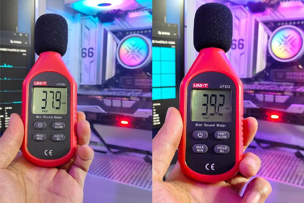 个人非常在意散热器的噪音表现,尤其是在夜间过高的运行噪音无法接受的,将测试设备放置在显示器前,关闭机箱内其它散热风扇,并关闭机箱侧透板的状态下,处理器从空闲到满载,散热风扇从650RPM提升至1000RPM,运行噪声仅提高不到2dB。