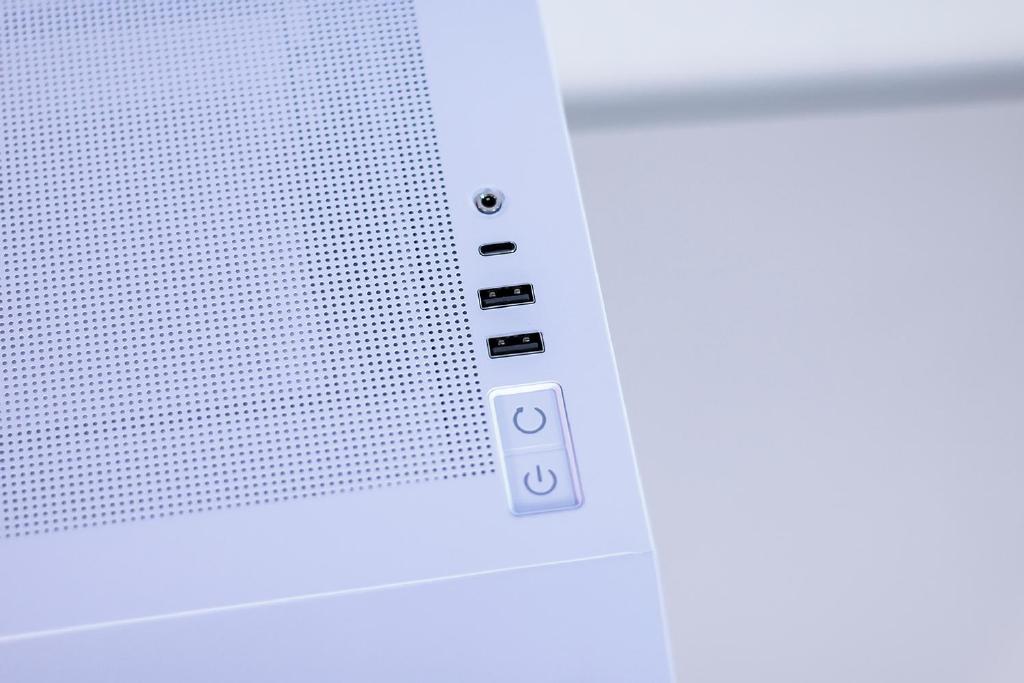 机箱的前置I/O接口与按键方面,配备了一个3.5mm音频接口,一个USB-C(USB3.1 10Gbps)数据接口,两个USB-A(USB3.0)数据接口,开机键与重启键,随机附带接口的防尘塞,假如不常用到前置数据接口,可防尘塞插入接口当中防尘防潮。