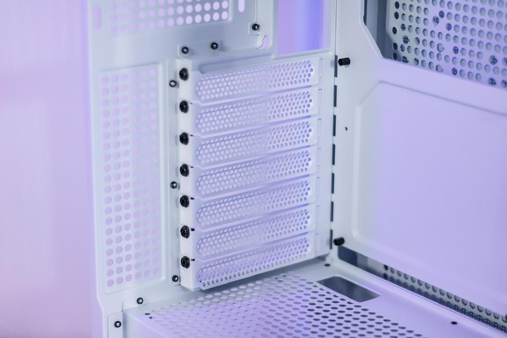 背部配备了七个PCIe扩展槽位,给了采集卡声卡等配件有足够的安装空间,机箱底部设计了可拆卸式防尘网,只需从机箱尾部抽出即可,防尘措施做得相当到位也便于日常清灰,机箱内很多部件可开合移动或者可拆卸,便于配合不同硬件各种安装方式。