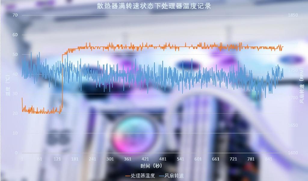 可以轻松应付其发热那么在散热器在满转速状态能将处理器的温度压到多少,在主板中手动将散热风扇的转速拉满,此时转速已经达到1750RPM,能将处理器的温度降至53℃,散热性能确实出众,不过散热风扇的运行噪音会明显的提高。