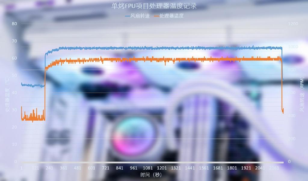 当时测试环境温度为15℃左右,持续压力测试半小时,此时散热风扇转速维持在1000RPM左右,处理器的核心温度稳定在60℃,对于处理器来说其实正常温度范围,整个测试过程温度曲线非常的稳定,意味着散热器能很好地压制处理器的发热,仍没实力全开还保留一定的余地。