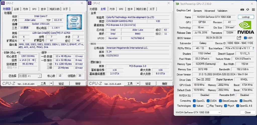本次搭配测试的硬件配置为英特尔十二代的i7-12700处理器,四条DDR4 3200MHz 8GB内存条,B660M芯片组主板以及GTX1060显卡,i7-12700与i7-12700K相比只是不锁倍频与不锁SA电压而已,两者在性能上并无什么明显区别,个人对超频的要求不高因此选择价格更低的i7-12700处理器。