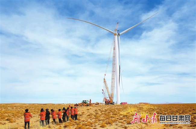 2月10日,工程人员正在张掖市甘州区平山湖30千瓦风电场进行风机吊装作业。?新甘肃·甘肃日报通讯员?杨永伟