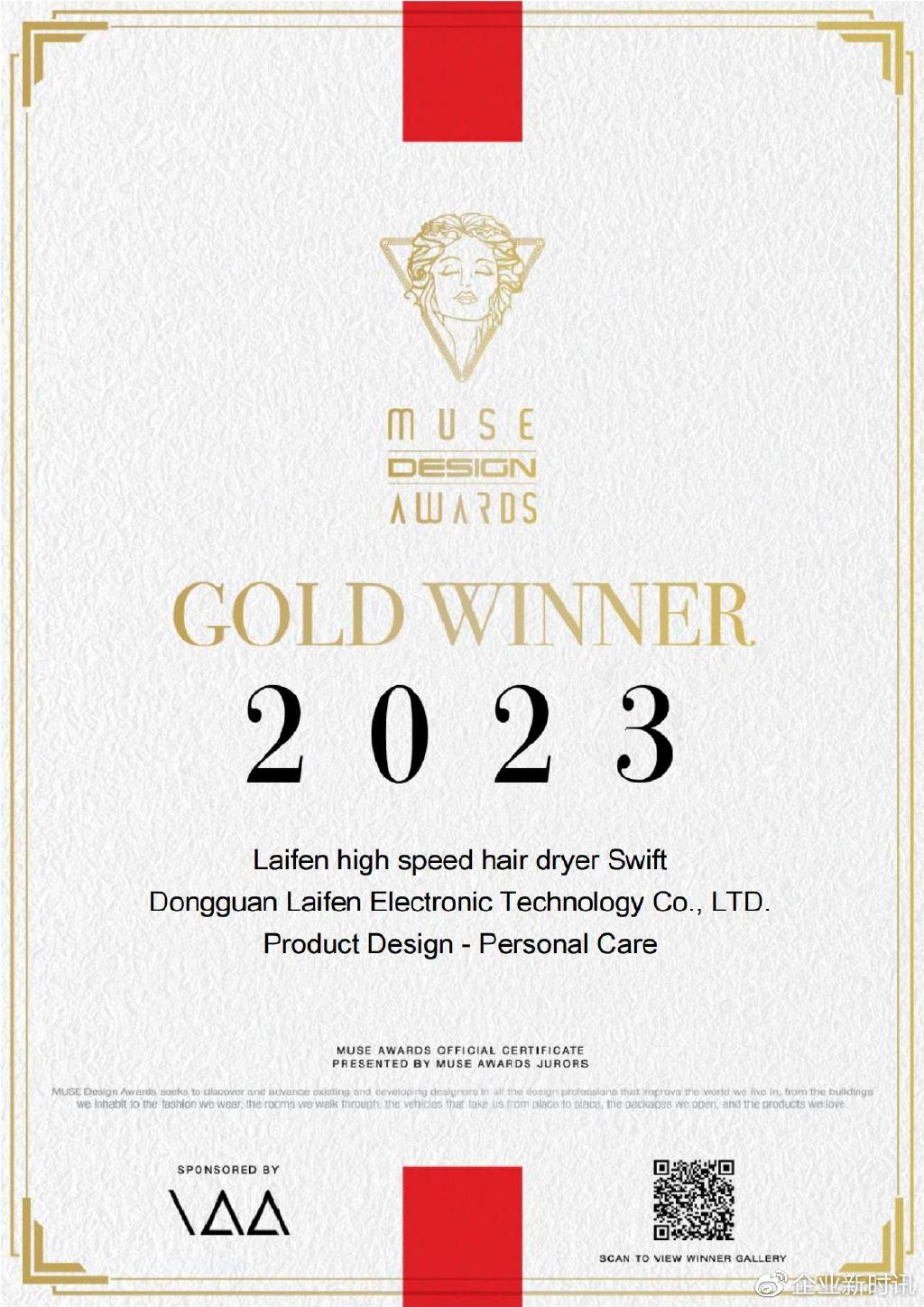 2023年缪斯设计奖(Muse Design Awards)已公布获奖名单,徕芬科技凭借其卓越的设计理念和创新能力,获得了缪斯设计金奖。这一荣誉证明了该公司在竞争激烈的评选中的优秀表现。