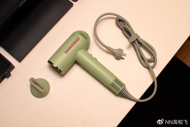 没营养的开箱环节就不给大家展示了,我们直接来看今天的主角--Joymay高速吹风机,造型方面采用了T型结构设计,机身整体没有任何的棱角显得十分的圆润,很符合当今主流的审美需求,无论是视觉还是握持感受上,个人都觉得还是不错的。对了,这款吹风机提供了两种配色选择,除了我上图所展示的苍葭绿之外,还有一款月影白。
