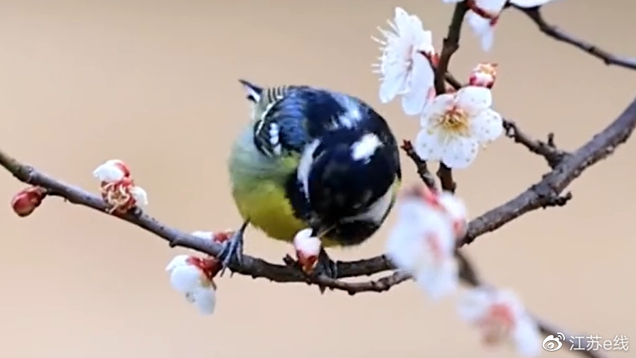 近日,江苏南京梅花山,朵朵粉白梅花间,一只小鸟驻足嬉戏,时而叼花瓣、时而啄花蜜,灵气可爱,花与鸟相映成趣。网友:再不赏花就被小鸟啄完啦。
