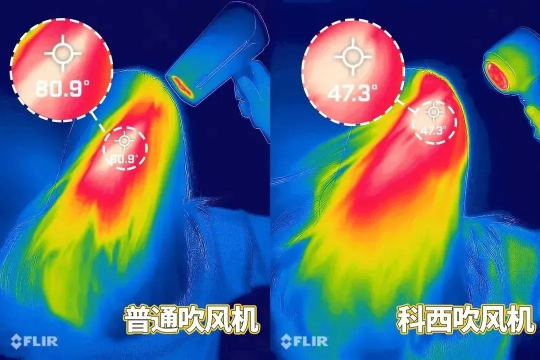 传统吹风机80.9℃,温度过高;科西吹风机只有47.3℃,不伤发~