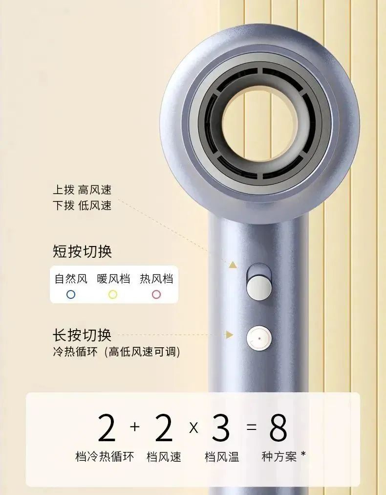 2挡风温风速调节,一键就能切换,8种吹风模式随便组合,满足大家各种的吹发需求。