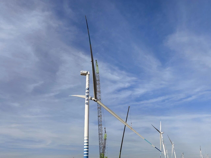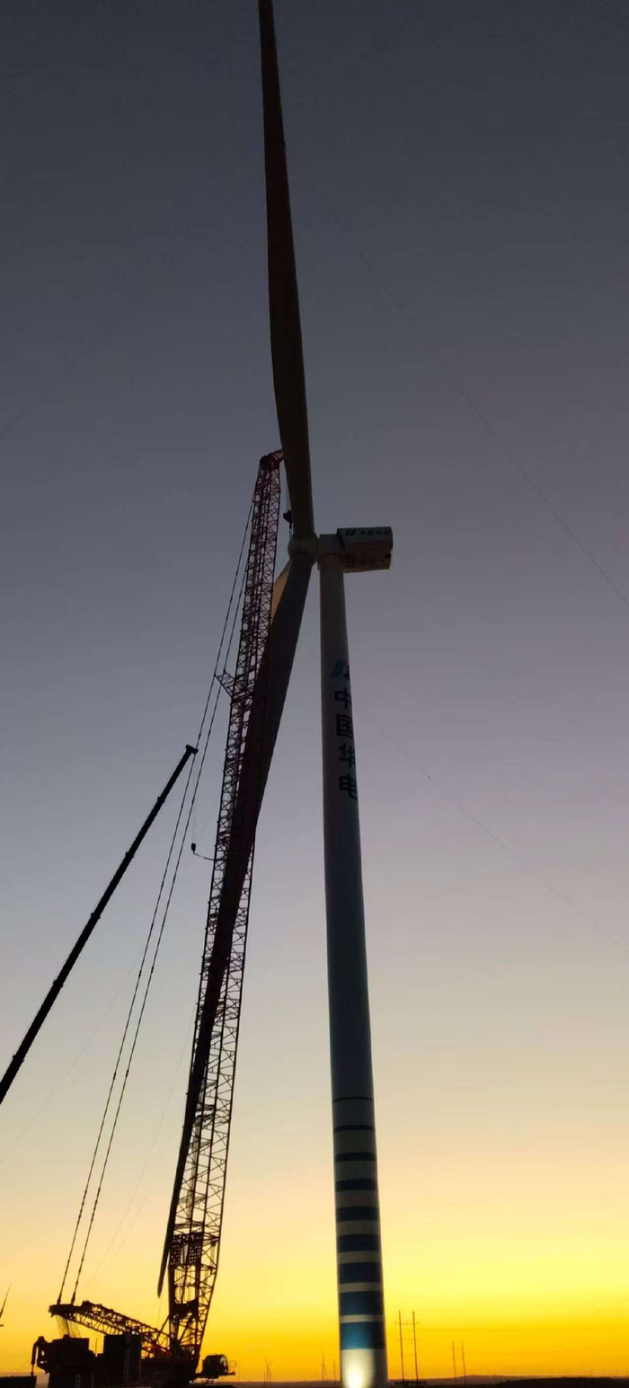 项目7标段位于天山北麓风能与光照资源富集区,采用风光同场、风光储多能互补的开发模式,此次吊装的11兆瓦风机为国内目前已投运的单机容量最大、叶轮直径最大的陆上风机,风机叶片长114米,轮毂中心高度124.9米,叶轮直径233米,扫风面积约等于3个标准足球场。在满发风速下,单台机组每转动一圈可发电21度。