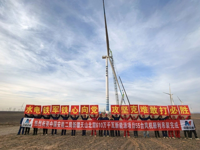 新疆华电天山北麓610万千瓦新能源项目是国内首个“沙戈荒”大基地外送通道新能源项目,是国家“疆电入渝”特高压工程的核心配套电源,也是目前新疆单体规模最大的新能源项目,项目位于新疆哈密市巴里坤县和伊吾县,装机容量610万千瓦,其中,风电420万千瓦、光伏180万千瓦、光热10万千瓦,配套建设120万千瓦/480万千瓦时的电化学储能装置。项目依托多类能源进行互补发电,结合储能技术进行调峰调频,实现风光储能一体化,推动当地能源结构转型,有效提升新疆电网清洁能源比例,对加快推进“三基地一通道”建设、实现“双碳”目标意义重大。中国安能二局主要承担了项目7标段施工任务,涵盖55台11兆瓦风电机组、150兆瓦光伏、150兆瓦/600兆瓦时储能系统以及一座220千伏汇集站等配套设施。
