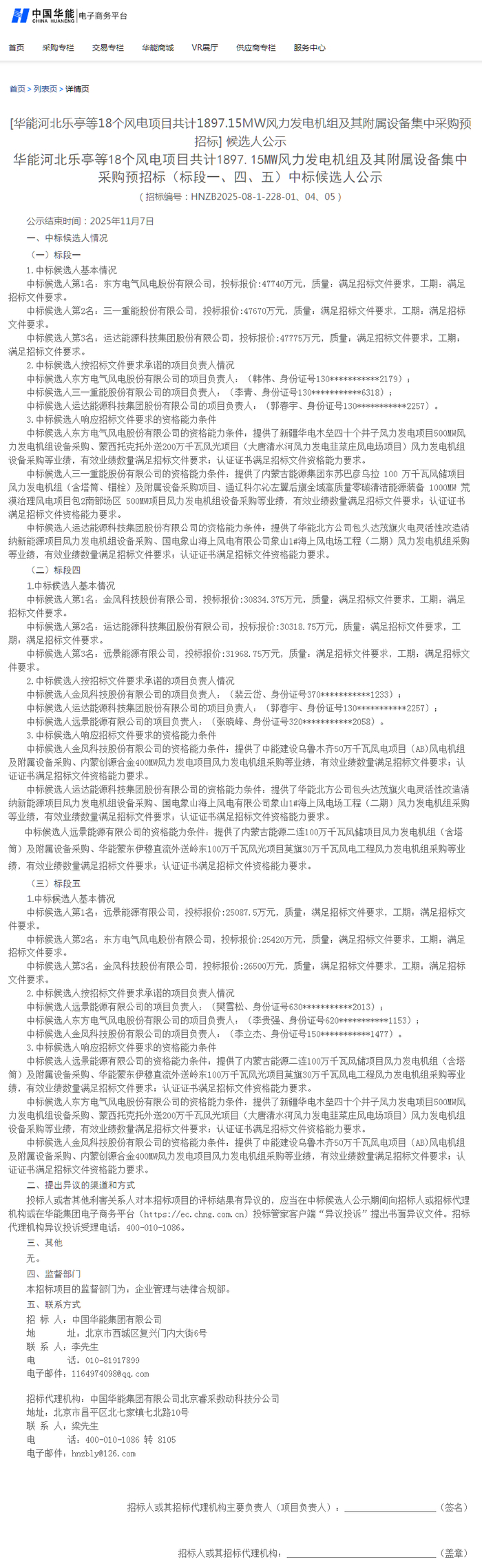 风电头条获悉,11月4日,华能河北乐亭等18个风电项目共计1897.15MW风力发电机组及其附属设备集中采购预招标(标段一、四、五)中标候选人公示,共3个风电项目,规模合计756.25MW。