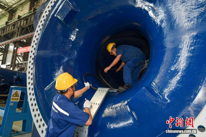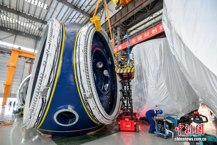 11月13日,海南东方,风电主机车间的工人正在加紧生产。位于海南省东方临港产业园的明阳科技新能源有限公司高端装备制造产业基地内,一排排巨型风电叶片整齐排列,蔚为壮观。该基地占地200亩,主要生产8-16MW超级紧凑混合驱动大型抗台风型海上风电主机、叶片及其关键部件,设计产能为200万千瓦/年。2024年2月,该公司自主研发的MySE292超大型叶片成功下线,叶片长度143米,叶轮直径292米,成为全球已下线叶轮直径最大的风电叶片。中新社记者 骆云飞 摄
