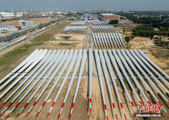 11月13日,位于海南省东方临港产业园的明阳科技新能源有限公司高端装备制造产业基地内,一排排巨型风电叶片整齐排列,蔚为壮观。该基地占地200亩,主要生产8-16MW超级紧凑混合驱动大型抗台风型海上风电主机、叶片及其关键部件,设计产能为200万千瓦/年。2024年2月,该公司自主研发的MySE292超大型叶片成功下线,叶片长度143米,叶轮直径292米,成为全球已下线叶轮直径最大的风电叶片。中新社记者 骆云飞 摄
