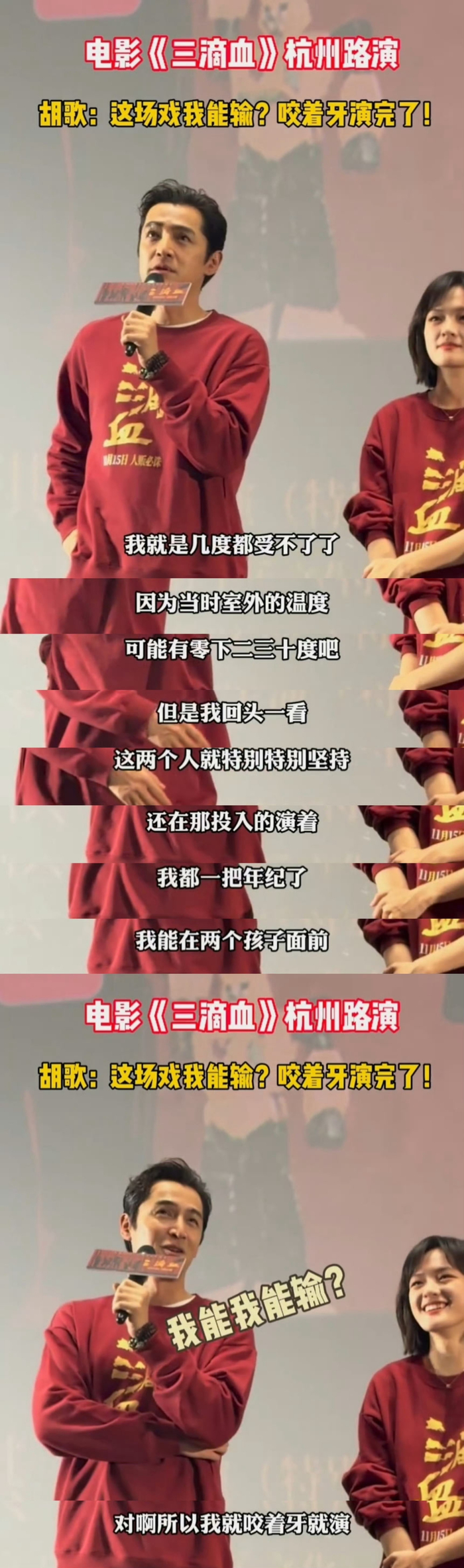#胡歌零下二三十度拍出胜负欲了# 胡歌拍《三滴血》太拼了!东北极寒+两米鼓风机双重暴击,见文淇和冰棍淡定咬牙坚持,路演解读的“寒冷生暖”太有深度~