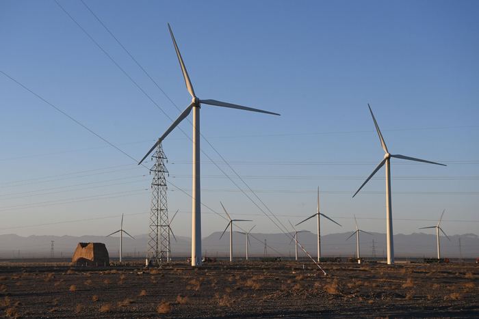 这是12月2日在甘肃省玉门市拍摄的戈壁滩上的风电机组。新华社记者 范培珅 摄在甘肃省玉门市