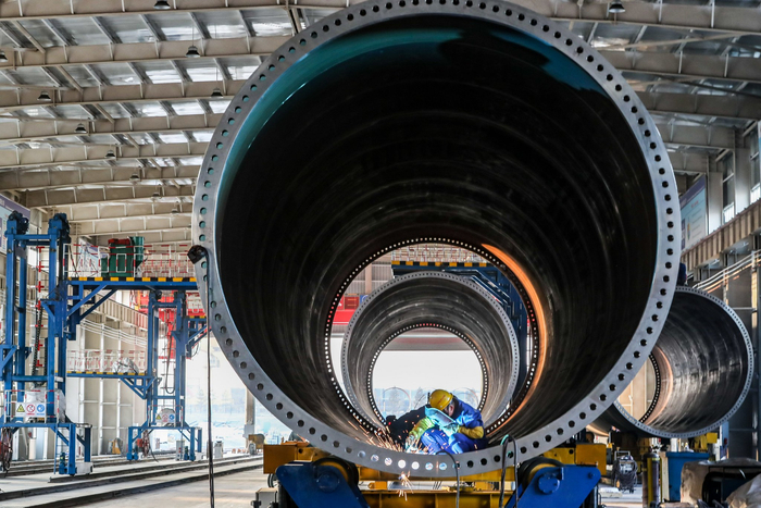 11月20日,在甘肃省酒泉经济技术开发区的中国水电四局(酒泉)新能源装备有限公司塔筒制造车间,工作人员进行风机塔筒焊接作业。 新华社记者 郎兵兵 摄