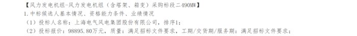 华电新疆发电有限公司相关招标项目新疆华电塔城和布克赛尔县105万千瓦风电项目风力发电机组(含塔架、箱变)采购招标项目标段二(490MW)第一中标候选人为电气风电,投标报价为9.88958亿元,折合单价为2018元/kW。