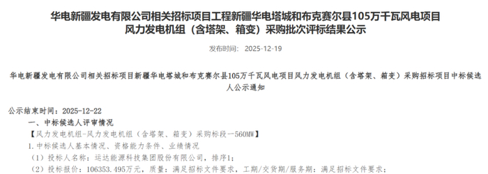 华电新疆发电有限公司相关招标项目新疆华电塔城和布克赛尔县105万千瓦风电项目风力发电机组(含塔架、箱变)采购招标项目标段一(560MW)第一中标候选人为运达股份,投标报价10.6353495亿元,折合单价为1899元/kW。