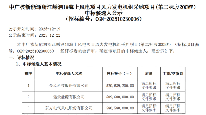 中广核新能源浙江嵊泗1#海上风电项目风力发电机组采购项目(第二标段200MW)第一中标候选人为金风科技,投标报价5.206392亿元,折合单价为2603元/kW。