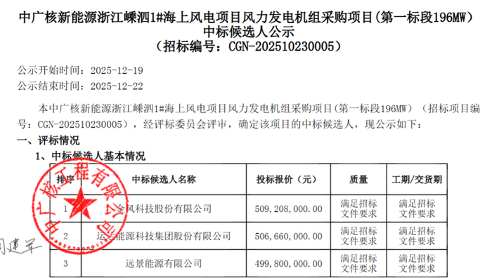 中广核新能源浙江嵊泗1#海上风电项目风力发电机组采购项目(第一标段196MW)第一中标候选人为金风科技,投标报价5.09208亿元,折合单价为2598元/kW。
