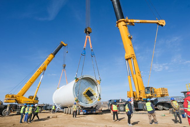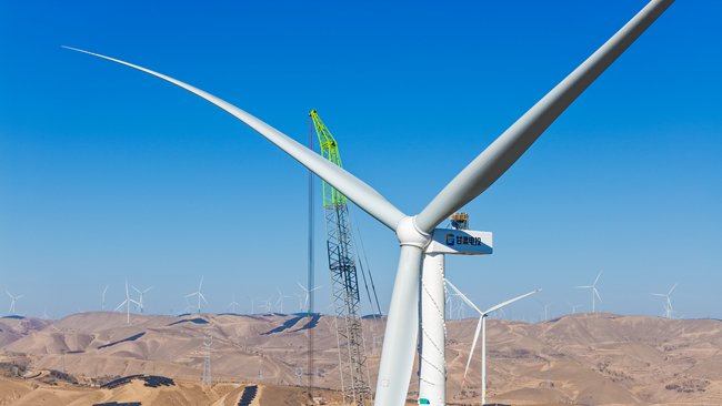 项目所在地甘肃环县地处毛乌素沙漠边缘,土质疏松、沟壑纵横,山地与断谷、盆地相间分布、地势起伏大,进场道路狭窄,对于大型设备的运输和就位难度挑战不小。吊装前,施工方专门组织技术团队对运输路线进行了反复踏勘和加固,确保设备安全进场。另外,针对风机吊装对风速、能见度等气象条件的严苛要求,施工方抓住窗口期的“黄金时间”,顺利完成了机舱、叶轮等核心部件的精准对接。针对风机吊装对风速、能见度等气象条件的严苛要求,他们抓住窗口期的“黄金几小时”,顺利完成了机舱、叶轮等核心部件的精准对接。为了保障吊装安全,他们反复优化吊装方案,严格落实安全交底,对作业人员开展专项培训,全程安排专人旁站监督,确保每一个环节都万无一失。