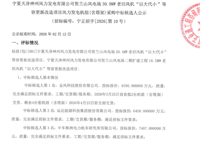 相关招标公告显示,本次招标涉及两个风电项目:宁夏天净神州风力发电有限公司贺兰山风电场20.4MW老旧风机“以大代小”等容更新改造项目、宁夏天净神州风力发电有限公司贺兰山风电场二期扩建工程10.5MW老旧风机“以大代小”等容更新改造项目(合计容量30.9MW)。