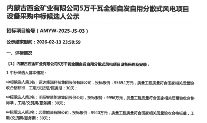 根据公告,内蒙古西金矿业有限公司5万千瓦全额自发自用分散式风电项目设备采购第一中标候选人为运达股份,投标报价为0.9569亿元,折合单价(按招标容量计算)为1914元/kW。