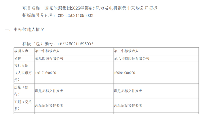 根据公告,国家能源集团2025年第4批风力发电机组集中采购标段二第一中标候选人为远景能源,投标报价为1.4818亿元,折合单价(按招标容量计算)为2058元/kW。